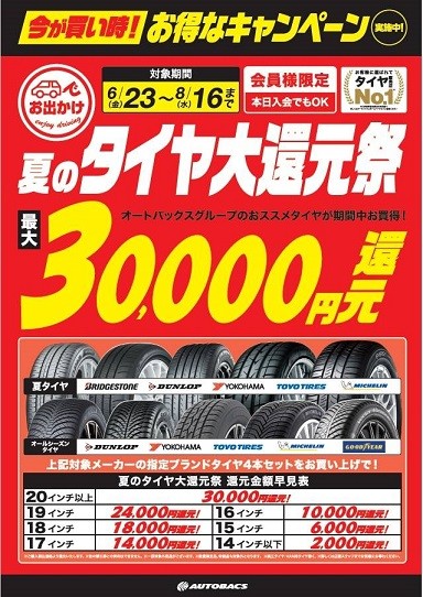 ①毎年恒例!!【夏のタイヤ大還元祭】最大30,000円還元。