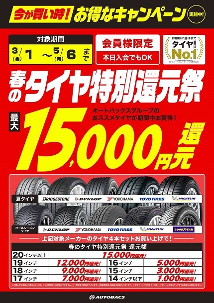 オートバックスグループがオススメするタイヤが期間中お買い得です。