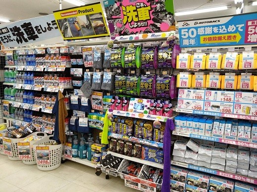 (オートバックス帯広店のレジ前に洗車グッズコーナー展開中)