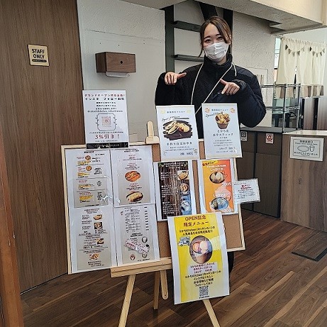 看板メニューは十勝産チーズをふんだんに使用したピザやホットドック、ポテトです。