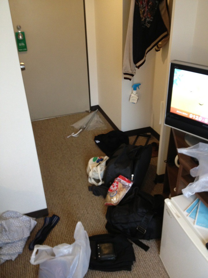 ビールとせんべえ食べて、せんべいをバッグの近くに