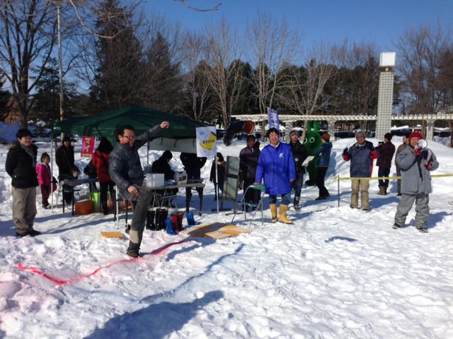 「まちマイ杯長靴飛ばし大会」MCをする梶山さんです。