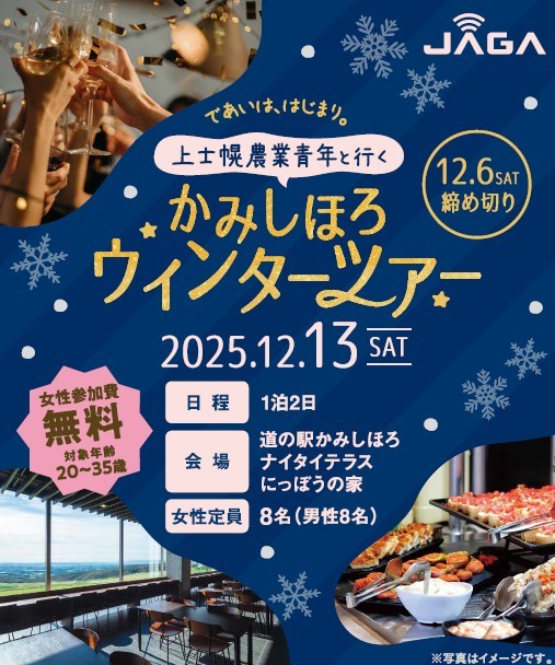 JAGAをお聴きの20歳から35歳までの独身女性のみなさん。クリスマス前にちょっと特別な冬の思い出を作りませんか?上士幌町の「ナイタイテラス」や、お洒落なレストランで過ごす1泊2日のスペシャルイベント「上士幌農業青年と行く ウインターツアー」の開催が決定しました!